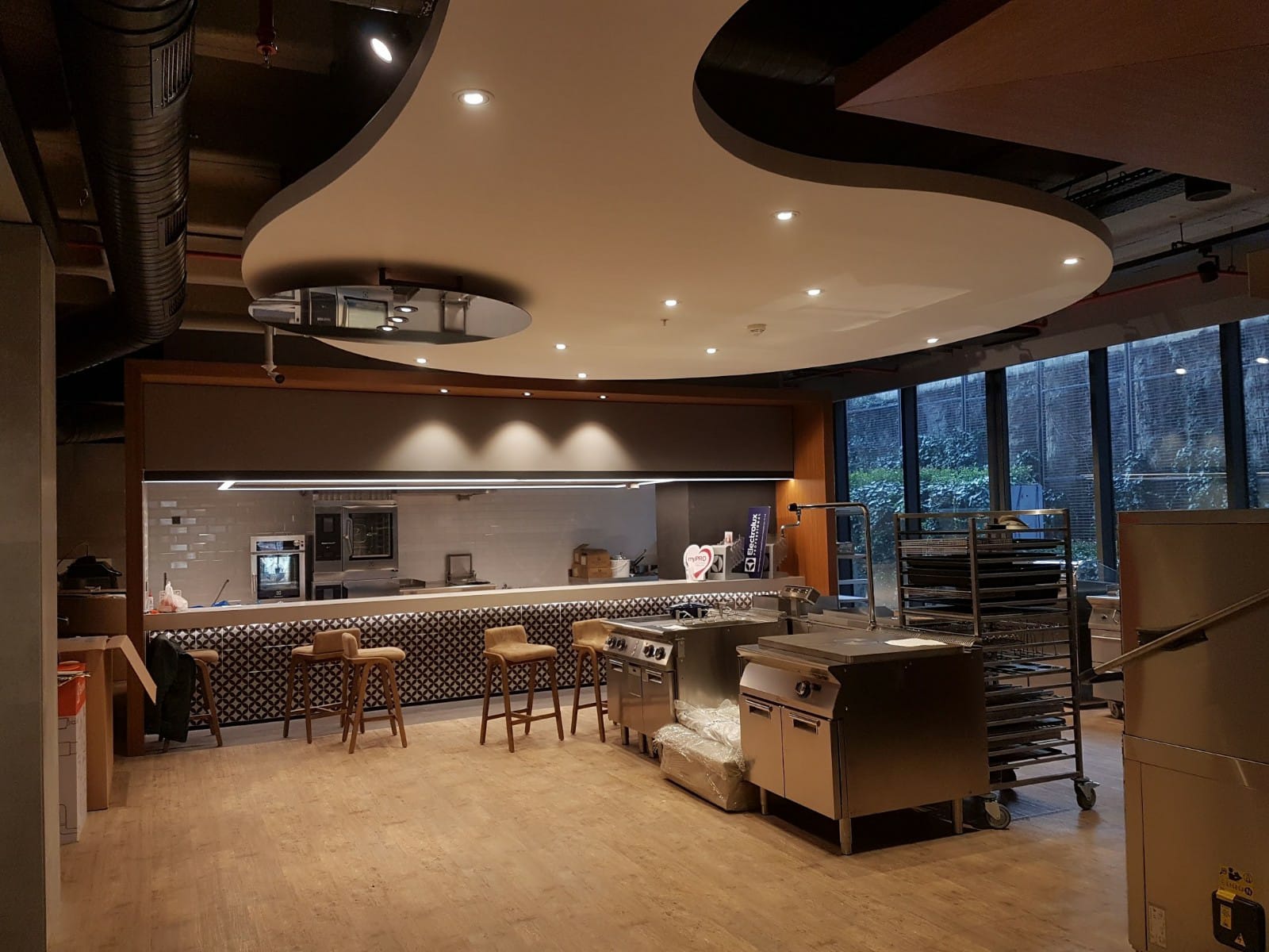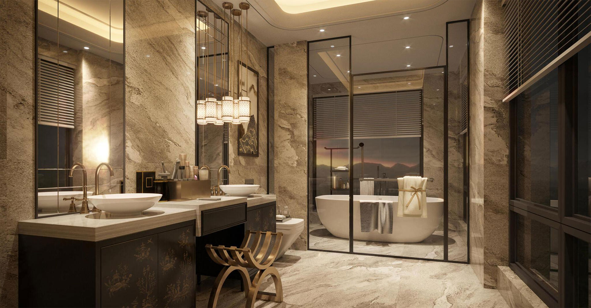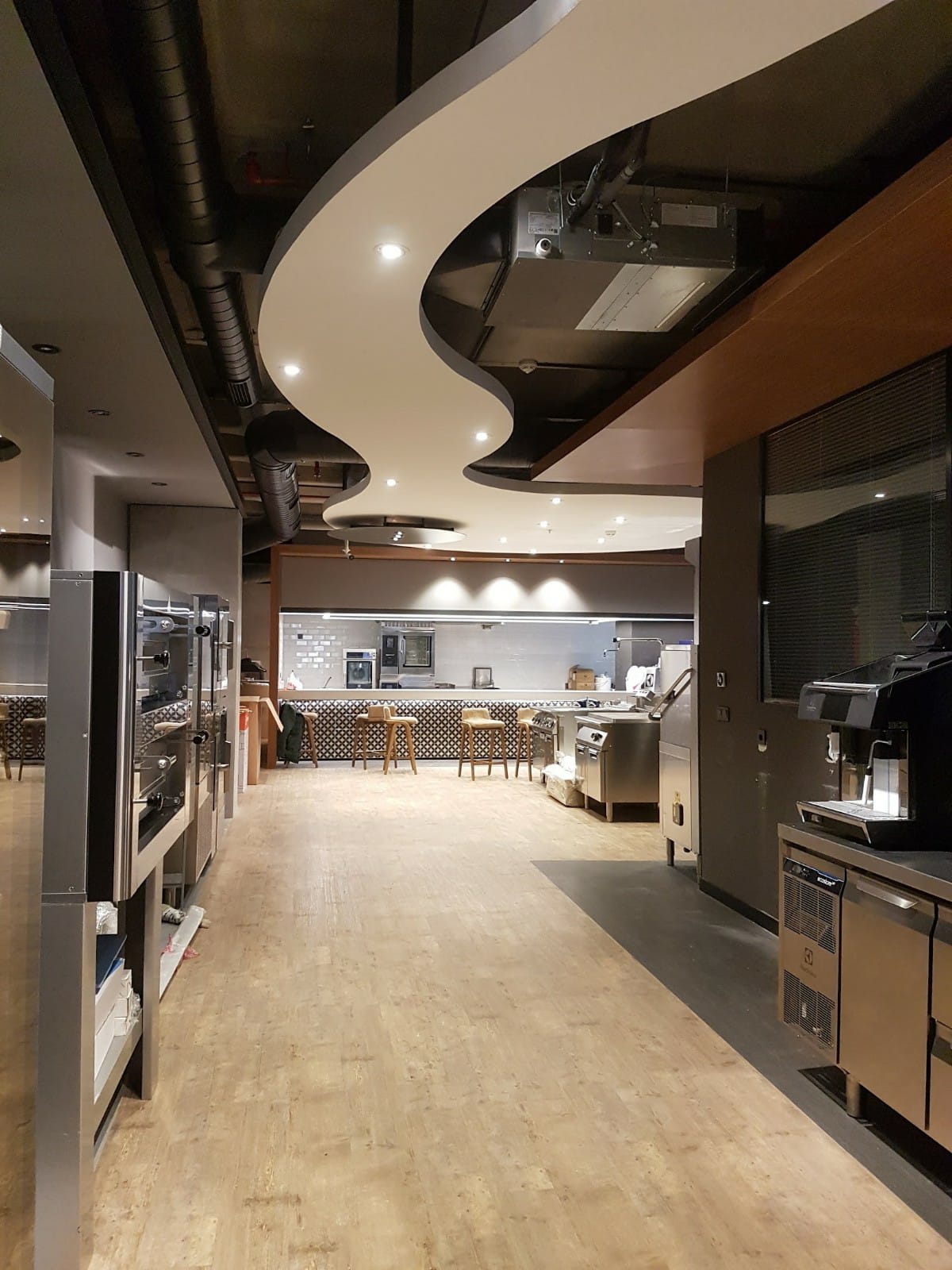 Duvar, zemin, tavan, aydınlatma ve dekoratif detaylar için kaliteli malzemeler seçilir.